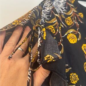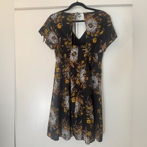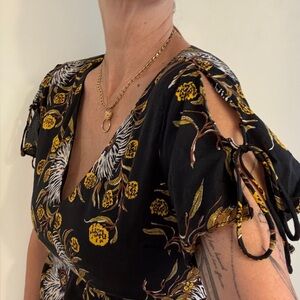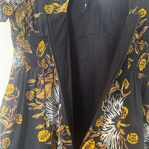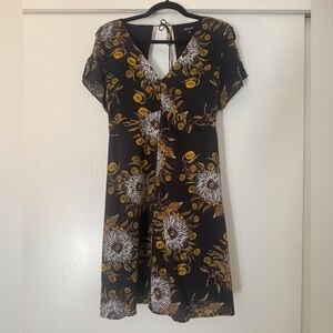 Madewell floral dress in size 6. Black ground with gold, white, and brown oversized botanical print. Deep V front, open back with tie closure and side zip, smocked waist panel with stretch. Flutter sleeves with tie details at the shoulders. Fully lined in 100% cotton. Shell is 51% cotton, 49% viscose.