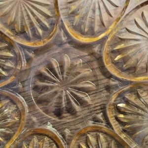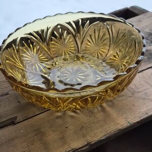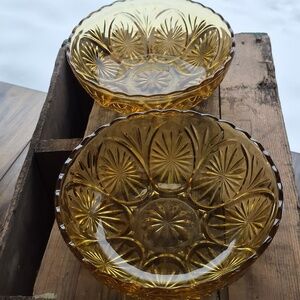Here are two of the same bowls made by Anchor Hocking in the Medallion Star and Cameo pattern. This is vintage piece reportedly from the 70's-although the design and colour pattern suggests an earlier era. It is 8 inches with a scalloped edge in a striking amber/honey colour. Both of these bowls are in great condition with no known impediments, please see photos (I am happy to add more photos upon request). Starburst design and scalloped edging give it a striking finish. Add these 2 identical pieces to your existing collection of servers or bowls
