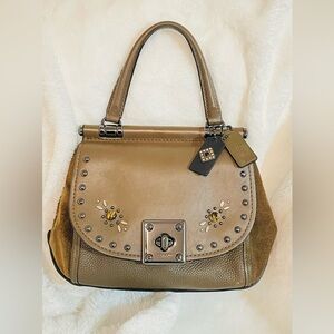 Coach top-handle satchel in olive and tan leather. Stud and jewel embellishments on the flap. Signature turn-lock closure. Detachable hang tags and polished hardware.