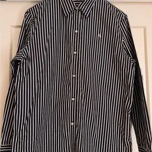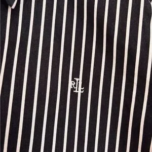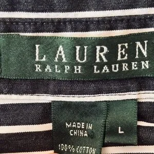 Ralph Lauren striped shirt in navy and white. Classic horizontal stripe pattern. Button-front style with woven label. Clean, versatile design.