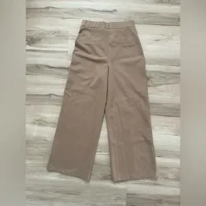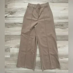 Wide-leg silhouette with a high-rise waist. Soft, smooth ponte-like fabric. Vertical front seams for a tailored look. Neutral taupe for easy styling.