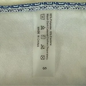 Stylish bikini set with a blue and white floral pattern. Features a bandeau top and matching bottoms.