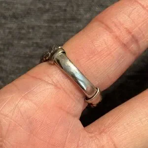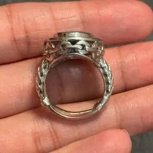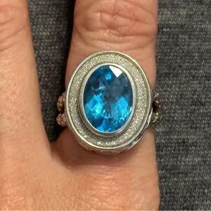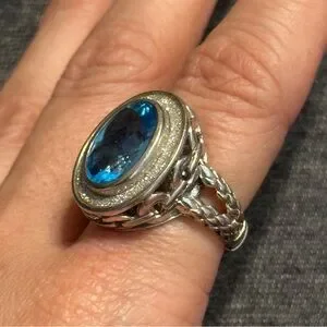 In great pre-loved condition. Striking sterling silver ring featuring an oval blue center stone and outer oval sparkle to enhance inner stone shiny. Adjustable inner band for tighter fit. The vivid blue gem creates brilliant sparkle and eye-catching color. A polished silver setting enhances the stone for a refined, wearable look. Ideal for daily wear or special occasions.