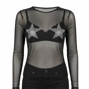 New Small Black Starry Night Sheer Jewel Long Sleeve Mesh Silver Long Sleeve Top
