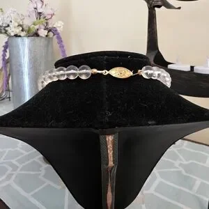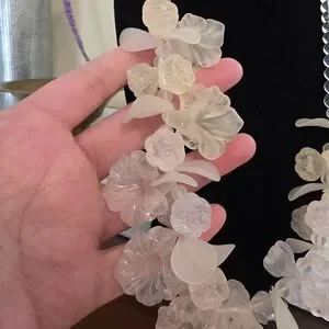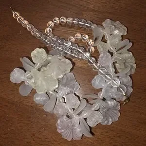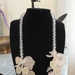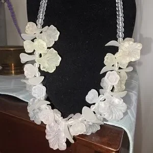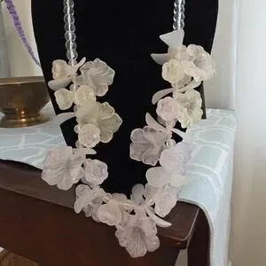 Elegant floral necklace featuring frosted white flower and petal beads. Lightweight translucent beads create a soft, feminine look. Perfect for dressing up day or evening outfits. Includes secure clasp for easy wear.