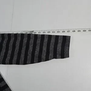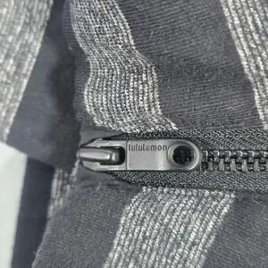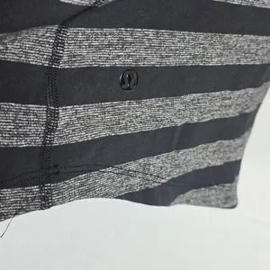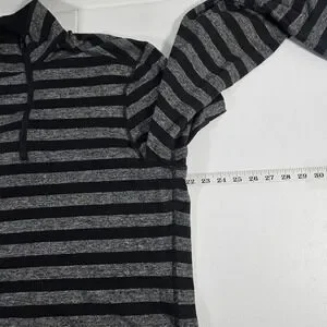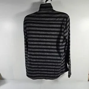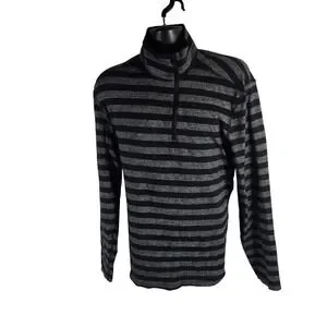 Men's Lululemon quarter zip pullover athletic long sleeve shirt. This top features a classic black and grey stripe pattern and a convenient quarter zip closure. The subtle Lululemon logo on the chest adds a touch of athletic sophistication. Perfect for your next workout, a casual day out, or layering for warmth.