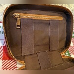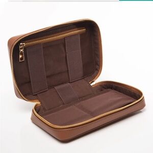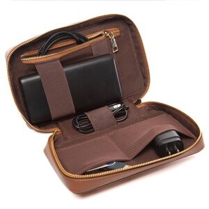 Keep your tech essentials neatly stored with this compact 8.5" x 5.5" recycled leather tech case in caramel. Designed to hold cables, batteries, USB drives, and other computer necessities, this case ensures that everything stays in its place, whether you’re on the go or organizing your desk.