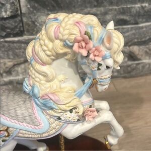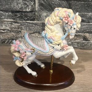 Delicate porcelain carousel horse. White body with pastel pink and blue mane accents. Floral details and gold accents. Elegant collectible display piece.