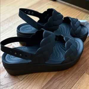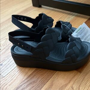 Braided crossover straps with slingback support. Cushioned contoured footbed for comfort. Lightweight platform sole adds subtle lift. Easy buckle closure on the heel strap.