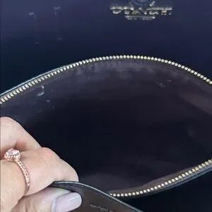 Sleek Coach tote in smooth black leather. Gold logo plaque detail on front. Double shoulder straps for easy carry. Structured silhouette that holds shape. Timeless, versatile style for daily wear.
