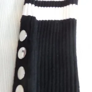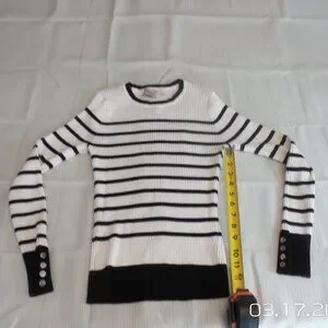 Like NEW ELIE TAHARI Women's Sweater White w/Black Horizontal Stripes, Cuffs and Waistband. Has four silver buttons on side of both cuffs. Size Medium. Soft, comfortable, form fitting and very stretchy. Worn once and washed in All Free and Clear detergent, never been in a dryer. From a SMOKE FREE and PET FREE home.