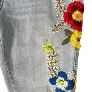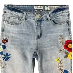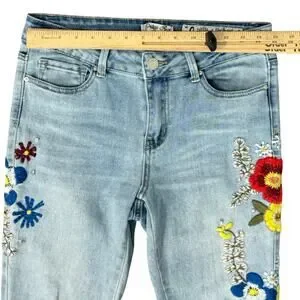 Indigo Rein Light Wash Blue Floral Embroidered Low Rise Chew Hem Jeans size 9