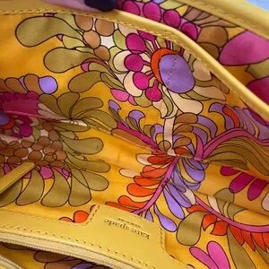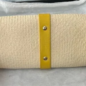 Stylish Kate Spade clutch with a woven cream texture. Accented by vibrant yellow trim and button detail. Ideal for adding flair to your outfit. She has one little mark on the outside that is faint to the right of the clasp and a couple small marks on the interior, which are extremely hard to see, but I tried to show them both in pictures