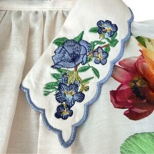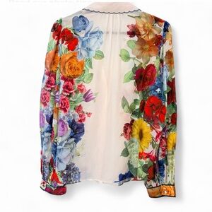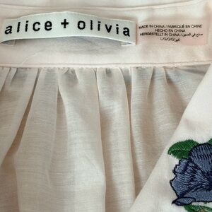 Stunning Alice + Olivia blouse featuring a soft pink/nude base with vibrant multicolor botanical floral placement print. This piece has a sheer, lightweight feel with a romantic drape and a standout embroidered statement collar.