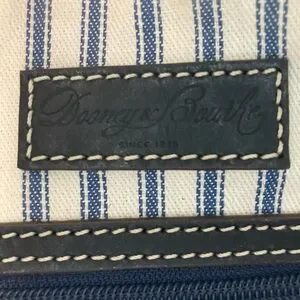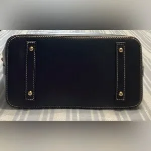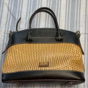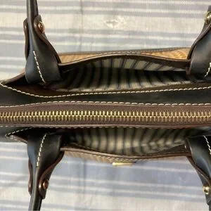 Dooney & Bourke textured tan and brown leather satchel. Gold toned hardware. Dark brown trim. Two exterior pockets. Full zip closure. Three internal pockets, security zip, and keychain holder. 14” x 11” x 6.” Handle drop is 4 1/2.” Used once or twice; like new!