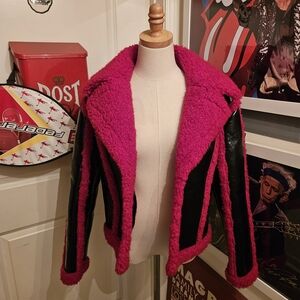 7 For All Mankind Black Faux Leather Jacket with Red Sherpa Trim