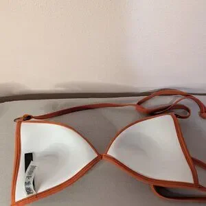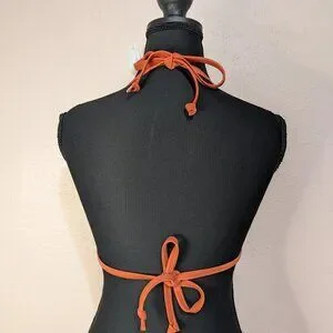 Keywords: victoria's secret, vs pink, pink swim, bikini top, halter, padded, orange, apple cinnamon, rust, swim top, swimwear, beach, resort wear, vacation, size medium, ring accents, summer, bathing suit.