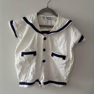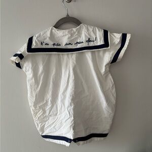 Charming white sailor style shirt with navy blue accents. Features a classic sailor collar and button details.