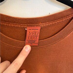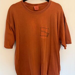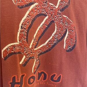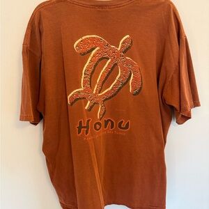 Rust orange short sleeve tee with large sea turtle graphic and "Honu" text on front. Bold beach-inspired print. Soft casual style. Great for everyday wear.