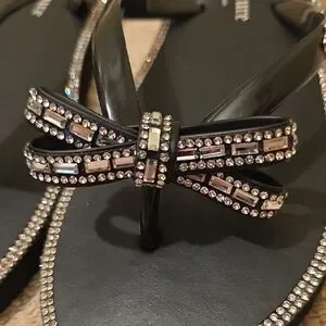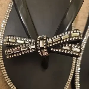 Elegant black sandals with sparkling rhinestone bow. Perfect for adding glamour to casual wear.