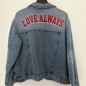 Stylish denim jacket featuring 'LOVE ALWAYS' on the back. Perfect for casual wear. From Target brand A New Day. - Great like new conditions. size XL.
