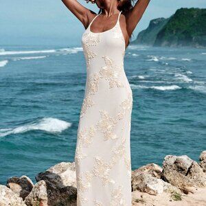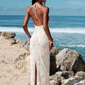 Elevate your style with this elegant apricot maxi dress, crafted from a lined body for comfort and featuring a backless design with a striking floral jacquian pattern. A spaghetti‑strap halter and cami silhouette highlight the shoulders, while the asymmetrical hem adds movement. The slim fit and natural mid‑waist line create a flattering shape, perfect for sophisticated occasions.