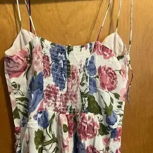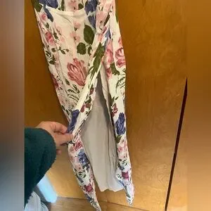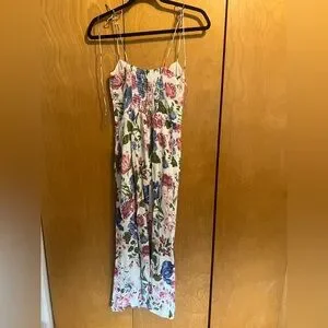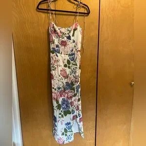 Elegant floral slip midi dress in white with pink and blue blooms. Features a fitted bodice, delicate spaghetti straps, and a flattering side slit. Lightweight and feminine for daytime events or special occasions.