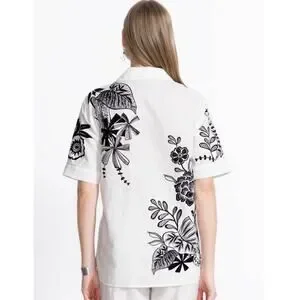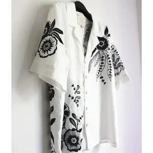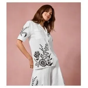 The Linen Camp Shirt is crafted from rich 100% linen. Thoughtfully designed with a convertible collar and a classic button-front this relaxed-fit shirt features stunning embroidered floral detailing and is finished with piping along the edges. Pair with the Ezra Pleated Linen Culottes and black flats for a polished casual look.