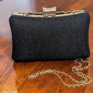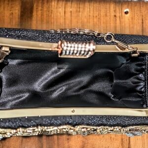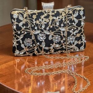This purse, sometimes called a kiss lock purse, is an elegant evening clutch with hard shell or hard case handbag. It features a black fabric background adorned with intricate, gold-colored floral designs. The embellishments include a variety of clear rhinestones and beads, adding sparkle and sophistication. It has a gold chain strap for carrying and a decorative clasp at the top, encrusted with rhinestones for extra glamour.