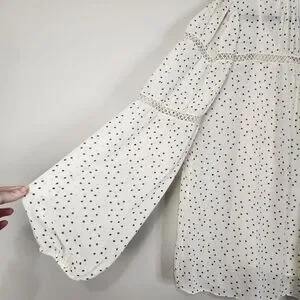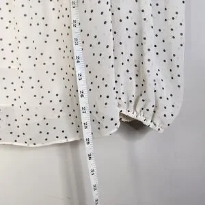 This charming women's blouse features a delicate black speck print on a cream background, adding a touch of elegance to any outfit. The lightweight flowy fabric and comfortable fit make it perfect for both casual and semi-formal occasions.