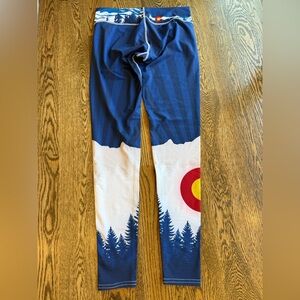 Soft blue and white leggings with a vibrant Colorado-style graphic. Comfortable stretch fabric. Bold red and yellow emblem adds fun, eye-catching detail. Easy to pair with tees and layers.