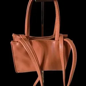 Compact mini tote in tan with an embossed logo front. Smooth leather-look exterior and dual top handles for easy carrying. Polished tan finish adds warmth to everyday outfits.