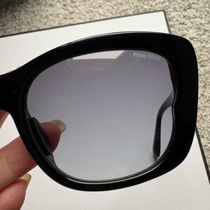 Stylish Miu Miu sunglasses with a glossy black frame. Perfect for a bold look.