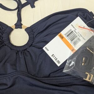 Elegant navy bikini with halter neck. Perfect for sunny beach outings.