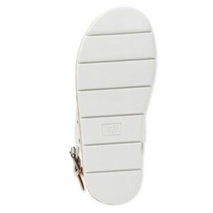 Chunky platform espadrille sandals by Time and Tru. Smooth white straps with metal rivet details. Rope-wrapped midsole and thick white lug outsole. Easy slip-on style with buckle accent.