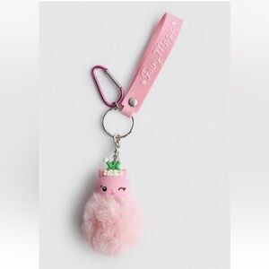 Cute pink pom pom keychain with a winking character charm. Includes matching pink strap and pink carabiner clip. Fun and whimsical accessory. Great for bags or keys.