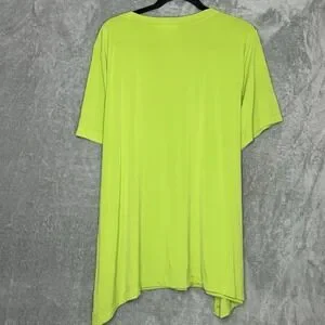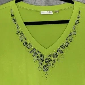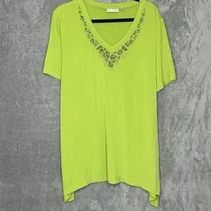 Dream Knits Quacker Factory XL Shirt Top Green Solid Short Sleeve V Neck Beaded