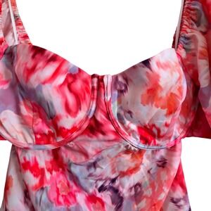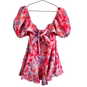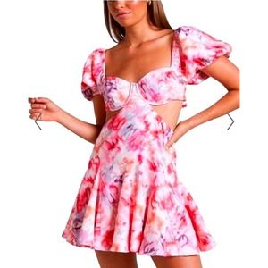 Keywords: puff sleeve, mini dress, floral print, sweetheart neckline, cut-out detail, tie back, summer dress, party dress, womens fashion, designer dress, trendy dress