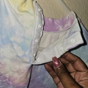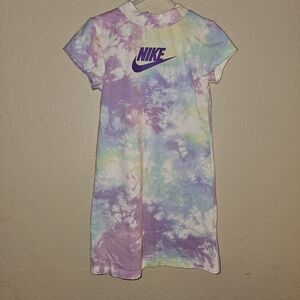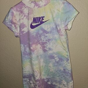 Vibrant tie-dye t-shirt dress with a purple Nike logo. Features a mix of pastel colors.