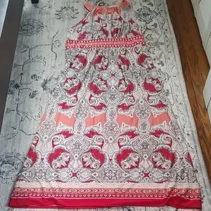 Sleeveless maxi dress with halter neckline. Bold paisley and ornate print. Coral panels with vivid red accents. Flowy A-line silhouette. Lightweight summer style.
