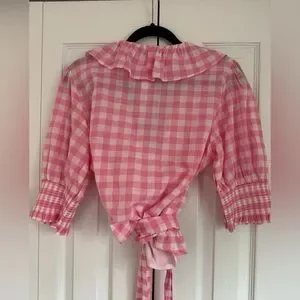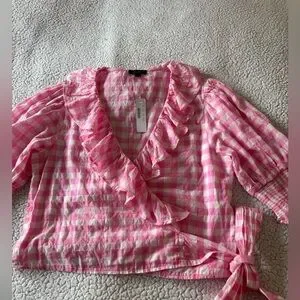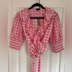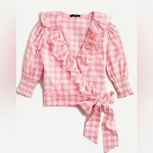 NWT J.Crew Pink Gingham Ruffle Wrap Short Sleeve Top Blouse Size L