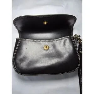 A vintage Dooney & Bourke 1975 Heritage Collection Leather Wristlet, style QT112 BL, in black smooth leather with contrast stitching and gold-tone hardware. Features a flap snap closure, detachable wrist strap, and the iconic marbled Heritage interior lining. Includes the original leather presentation box, dust bag, and registration card, making this a highly desirable collector’s set.