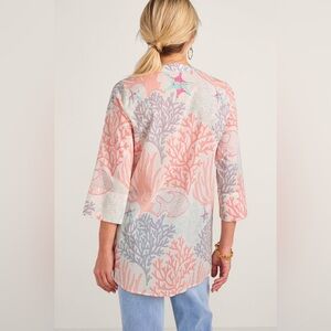 Take a peek beneath the sea in a cool cotton shirt with a fanciful print, accented with colorful beads and intricate embroidery. Detailed with a button closure, pintucks, 3/4 sleeves and a shirttail hem. So cute over swimwear, too.