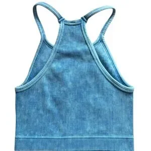 Description: Fabric 90% Nylon 10% Spandex | comfy layer | wear alone as a crop top or as a bra | Ribbed | Cropped | adjustable Strap | Racerback | Tank Top / Bralette / Brami / Cami | Padded | Mineral Washed |Moderate high neckline | Ribbed Detail on outer layer - inside layer against skin is a soft brushed finish | SUPER comfy!! | super stretchy too!