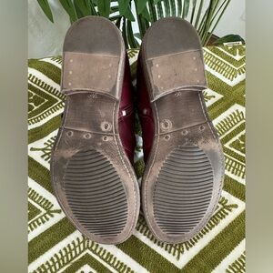 These are rare as the newer style has brass buckles and these are leather covered. Super soft burgundy leather ankle boots with soft supple leather lining. Ruched leather for a comfortable, broken-in look. Low stacked heel and cushioned insole for all-day wear. Versatile burgundy color pairs well with casual and dressy outfits.