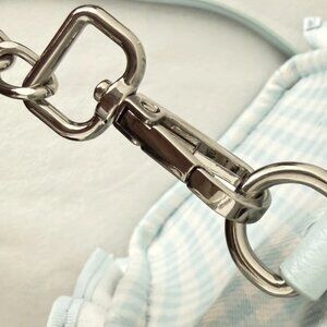 Add a touch of coquette aesthetic to your outfit with this adorable Luv Betsey by Betsey Johnson bag. This bag features a charming light blue and white gingham (checked) pattern crafted from durable fabric/canvas. The design is accented with playful vertical ruffles on the sides and a signature silver-tone metallic heart emblem on the front and removable fur charm of a heart . It comes with dual top handles and a matching long adjustable and removable crossbody strap for versatile carrying options. Perfect for a feminine, trendy look!