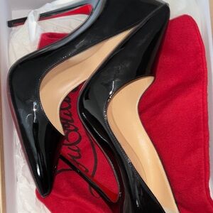 Classic Christian Louboutin pumps in glossy black patent. Pointed toe and high stiletto heel. Signature red lacquered sole for striking contrast. Sleek, elegant design ideal for evening wear.