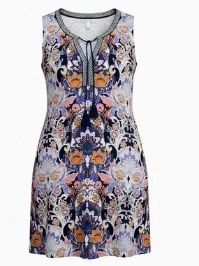 The vibrant boho-inspired pattern includes shades of navy blue, soft pink, and warm orange, creating a standout look that’s perfect for casual outings, work, or vacation. Finished with a keyhole neckline detail for added style.