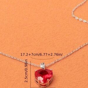 Elegant silver-tone heart pendant featuring a vibrant red crystal centerpiece. The red stone adds bold color and sparkle to any outfit. A delicate silver chain and detailed bail complete the polished look. Perfect as a romantic gift or everyday accent
