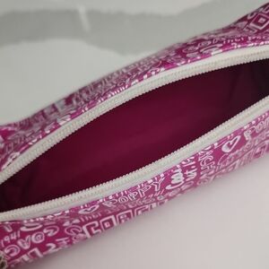 Magenta Coach Poppy cosmetics bag with bold white lettering. Zipper closure with charm accent.